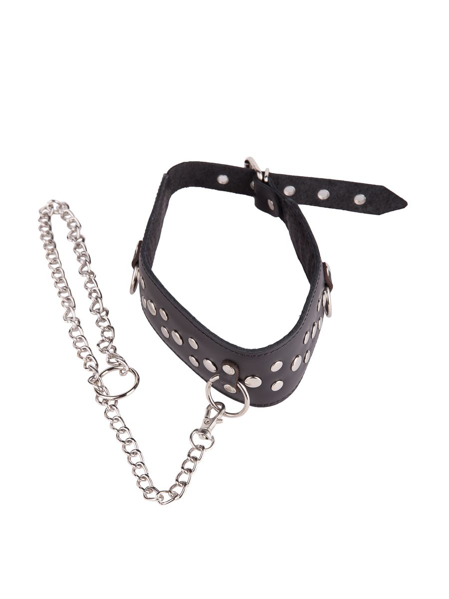 Чёрный кожаный ошейник с карабином и поводком