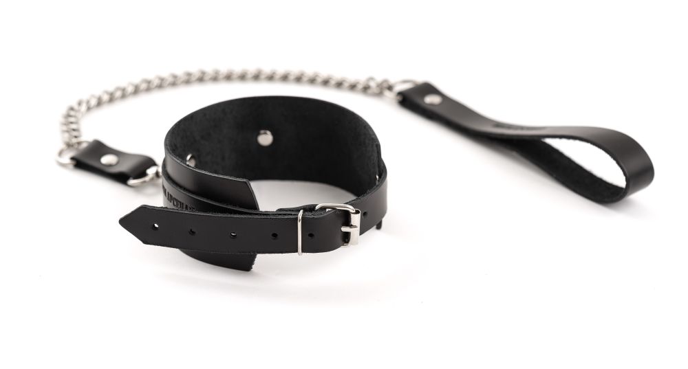 Ошейник в лаконичном дизайне, выполнен из качественной, натуральной кожи. Впереди декорирован серебристым кольцом. В комплекте поводок из металла с удобной кожаной ручкой. Размер универсальный, регулируется с помощью ремешка, подойдет на обхват от 30 до 40 см. Ширина ошейника - 5 см, ширина ремешка - 2 см.