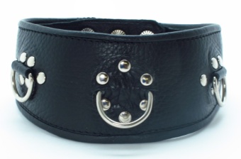 ОписаниеЧёрный кожаный ошейник с полукольцами и клёпками.