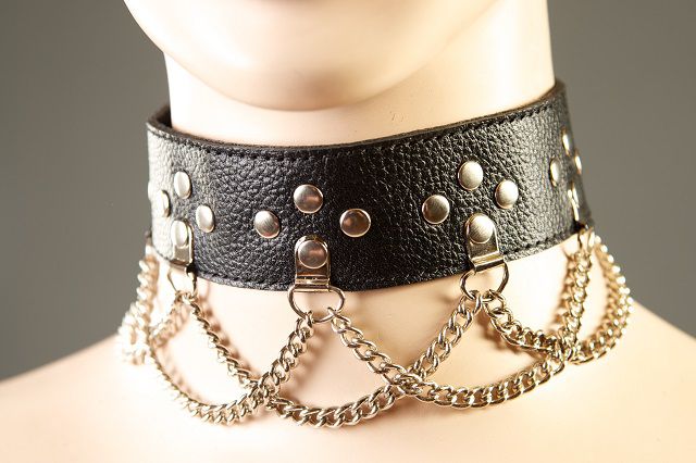 Ошейник с цепочками - изысканный аксессуар из натуральной кожи, великолепно будет смотреться с вашим любым эротическим костюмом для сексуальных игр. Этот ошейник на мягкой подкладке идеально подходит для повседневной носки. Ошейник изысканно украшают свисающие тонкие цепочки и мелкие плоские пукли, расположенные крестообразным узором. Размер ошейника регулируется с помощью ремешка-застежки. Этот девайс обостряет ощущения и позволяет открыть новые грани чувствительности. Ширина - 3,5 см.