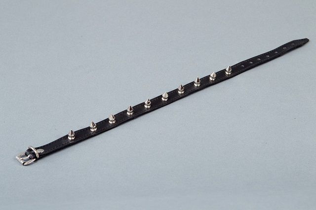 Узкий ошейник выполнен из натуральной кожи высокого качества и декорирован металлическими шипами. Застегивается на ремешок с пряжкой. Ширина - 1,5 см.