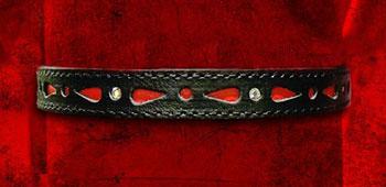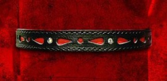 Стильный, изящный ошейник из натуральной кожи превосходного качества. Оформлен россыпью страз белого цвета и каплевидным резным рисунком. Замок - липучка. Ширина - 1,5 см.