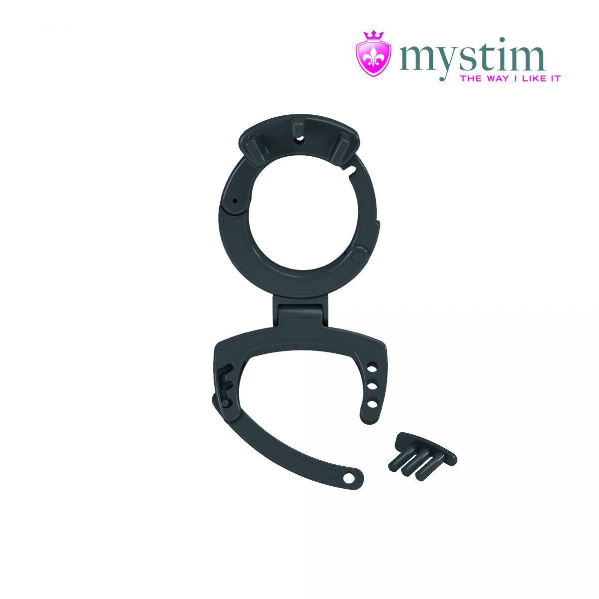 Пояс верности Mystim Pubic Enemy No 3 состоит из нескольких частей, которые делают игрушку максимально удобной и практичной. Как и многие модели до этого, главная часть девайса — пластиковый корпус, который имеет анатомическую форму и надевается на член во время игры. Внутри корпуса расположились электропроводящие части (силикон с добавлением платины), а по бокам есть отверстия для подключения генератора импульсов, который приобретается отдельно. Длина девайса 8 см, внутренний диаметр 3,5 см, а самый широкий внешний — 4,7 см.