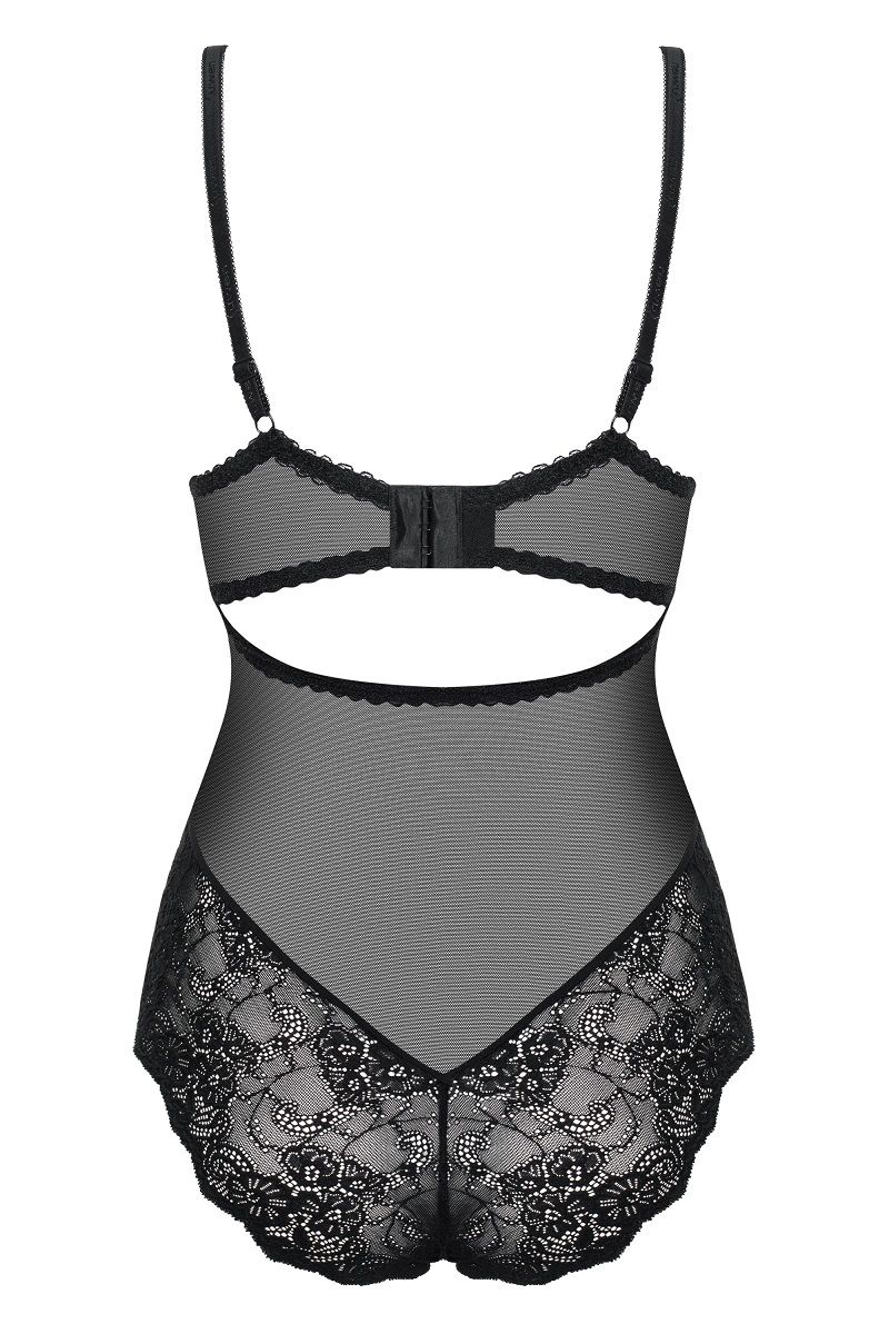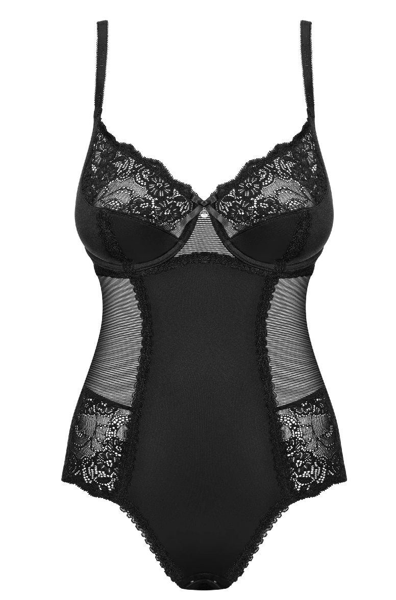 Боди Amallie выполнено из эластичной ткани в сочетании с полупрозрачными вставками. Комбинированные чашечки на косточках, верх выполнен из кружевного полотна, а низ на тонком поддерживающем поролоне. Бретели и регулируются по длине, на спинке застежка на крючки-петли.