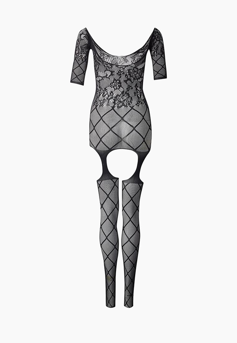Чёрный комбинезон с ажурной верхней частью и имитацией крупной сетки снизу. С интимным доступом. Нежный, приятный на ощупь материал позволит вам чувствовать себя комфортно, а уникальный дизайн модели не даст отвести от вас взгляд. Благодаря уникальному пошиву и дизайну боди-комбинезон визуально стройнит фигуру, а также подчеркивает все самые аппетитные части тела. Трусики не входят в комплект!