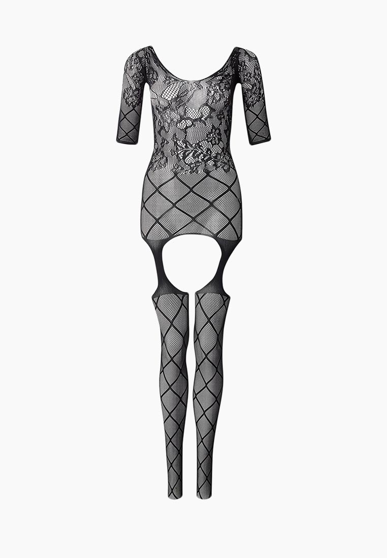 Чёрный комбинезон с ажурной верхней частью и имитацией крупной сетки снизу