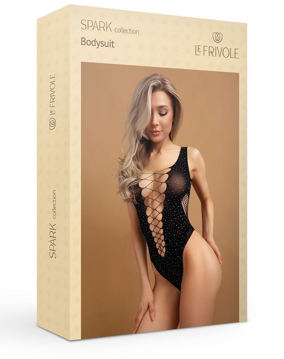 В данном боди черного цвета имитация шнуровки есть как спереди, так и сзади, очаровывая всех в два раза сильнее. Кристаллы, равномерно распределенные по всей площади изделия создают ощущение дороговизны и праздничности. Низ выполнен трусиками стринг, поэтому ягодицы выглядят подчеркнуто. Особый состав и плетение не сковывает движения и не перетягивает тело, а значит вам будет комфортно!