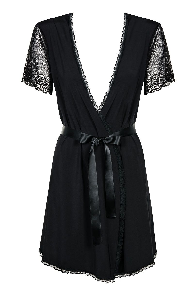 Небольшая длина, подчеркивающая красоту ног, строгий черный цвет, отсутствие воротничка, длинный пояс из атласной ленточки, кружевная оторочка, рукавчики из ажурного полотна – ням-ням! Трусики-стринги в комплекте. В комплекте: пеньюар, трусики-стринги. -