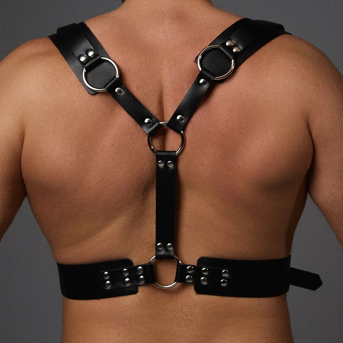 Черная кожаная мужская портупея с регулируемыми ремешками. На спинке красивое Y-образное соединение кольцами.