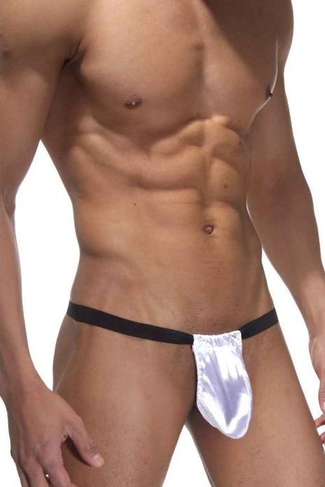 Трусы для мужчин, открытые, состоящие из гульфика, который сшит из белого гладкого атласного материала, и черной, довольно широкой резинки на поясе. Ягодицы открыты полностью.
