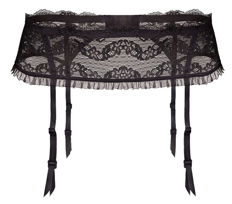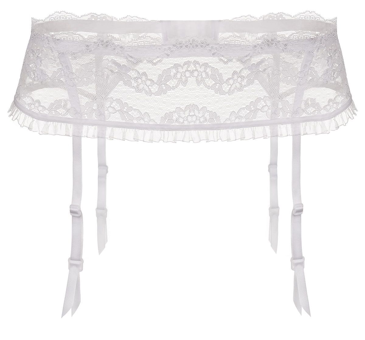 Широкий кружевной пояс для чулок с цепочками цветков на сеточке. Нижняя часть отделана искусной оборкой, длина резинки и застежка регулируются. Женственный и элегантный.