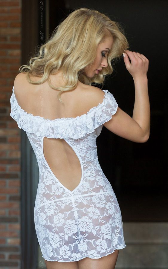 Открытые плечи, белизну которых подчеркнёт пышный волан, открытая спинка в вырезе-овале и упругие грудки под полностью прозрачным лифом… И вас ещё гложут сомнения с таким арсеналом? В комплекте: сорочка, трусики-стринги.