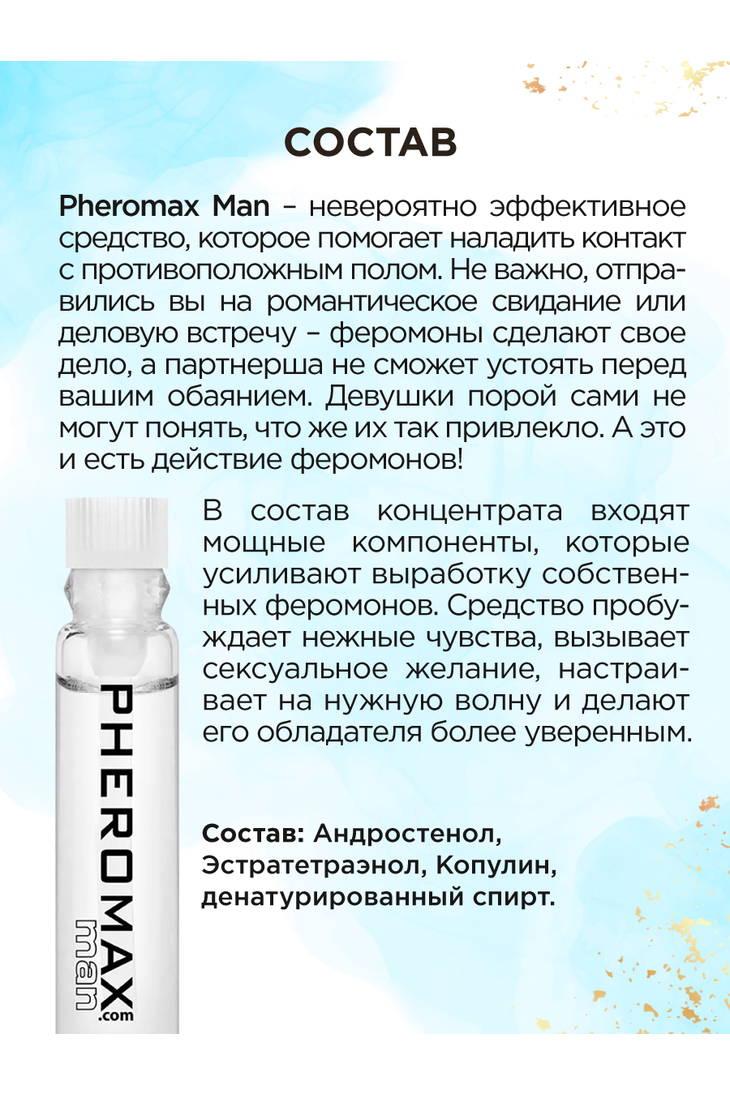 Pheromax for Men - это синтезированный концентрат феромонов, которые производит мужчина. На сегодняшний день эти феромоны самые сильные и действенные, поэтому достаточно нанести всего 1 каплю на пульсирующие места (уши, шея, интимная зона), чтобы они начали незамедлительно свою работу.