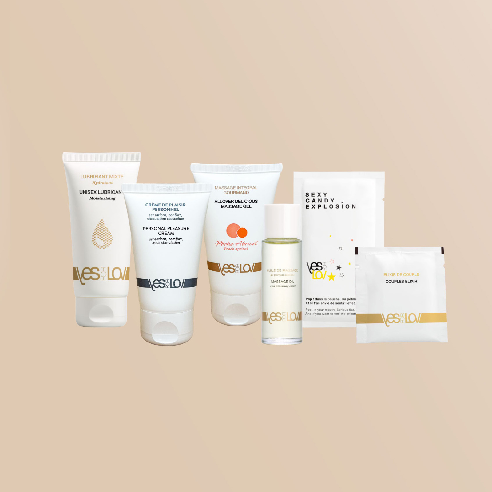 Набор YesforLov La Trousse Enchantée упакован в мягкую бархатистую косметичку бежевого цвета, дополненную удобной застёжкой на молнию. Внутри косметички находится: