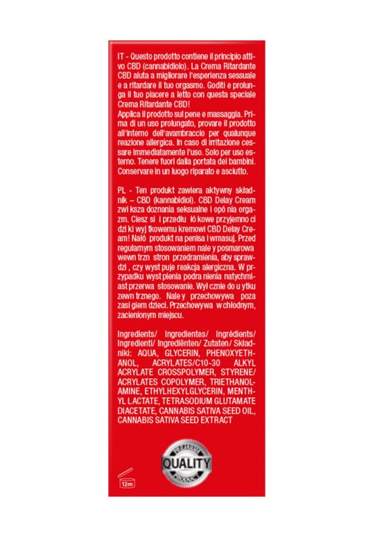 Крем-пролонгатор CBD from Amsterdam содержит активный ингредиент CBD (каннабидиол). CBD Delay Cream помогает улучшить сексуальный опыт и отсрочить оргазм. Нанесите продукт на половой член и помассируйте дождитесь полного впитывания крема. Перед регулярным использованием проверьте внутреннюю часть предплечья на наличие аллергических реакций. Если возникнет какое-либо раздражение, немедленно прекратите использование. Только для наружного применения. Хранить в прохладном темном месте.