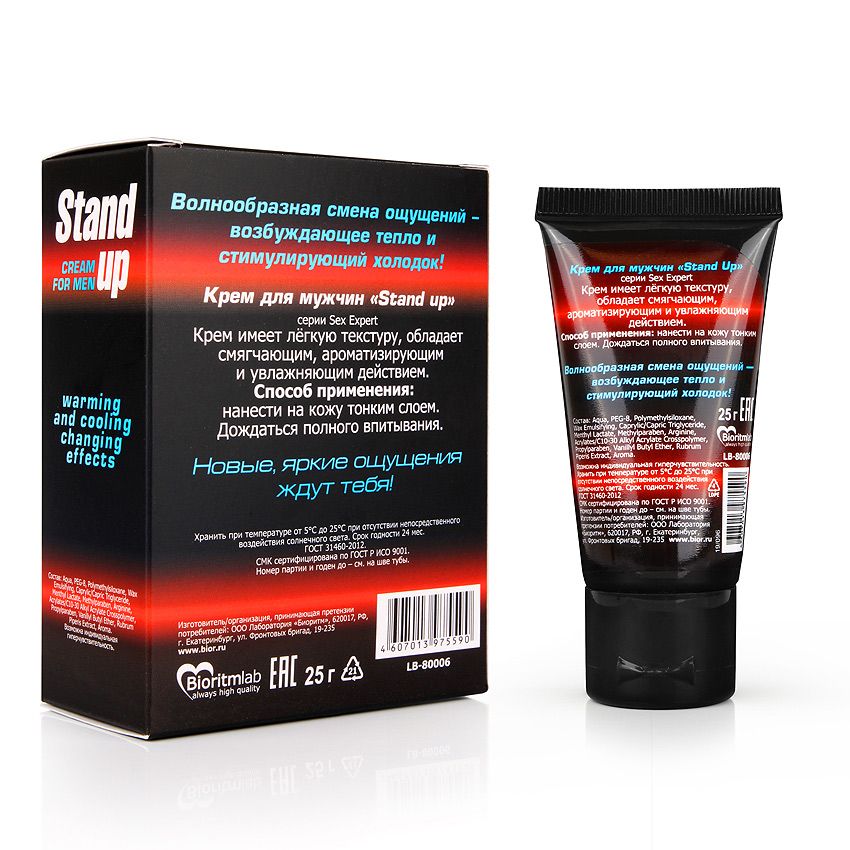Крем для мужчин Stand up отлично подойдет тем, кто хочет хорошенько разогреться перед интимной близостью. Нанесите это средство массажными движениями на член за 5-10 минут до начала полового акта, чтобы увеличить кровообращение и улучшить эрекцию.