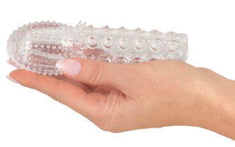 Насадка сделана из прозрачного скользкого материала со стимулирующующей выпуклой структурой и с мягкой пеной заполнившей наконечник. Способствует более длительной эрекции.С нежными шипами и рельефом. -