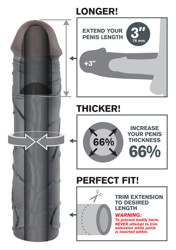 Удлиняет на 76 мм, увеличивает диаметр мужского достоинства на 66 %. Цвет: Черный. Размер: длина - 22,8 см, диаметр - 5 см; внутренний минимальный диаметр - 3,2 см. Материал: TPE-Elastomer.
