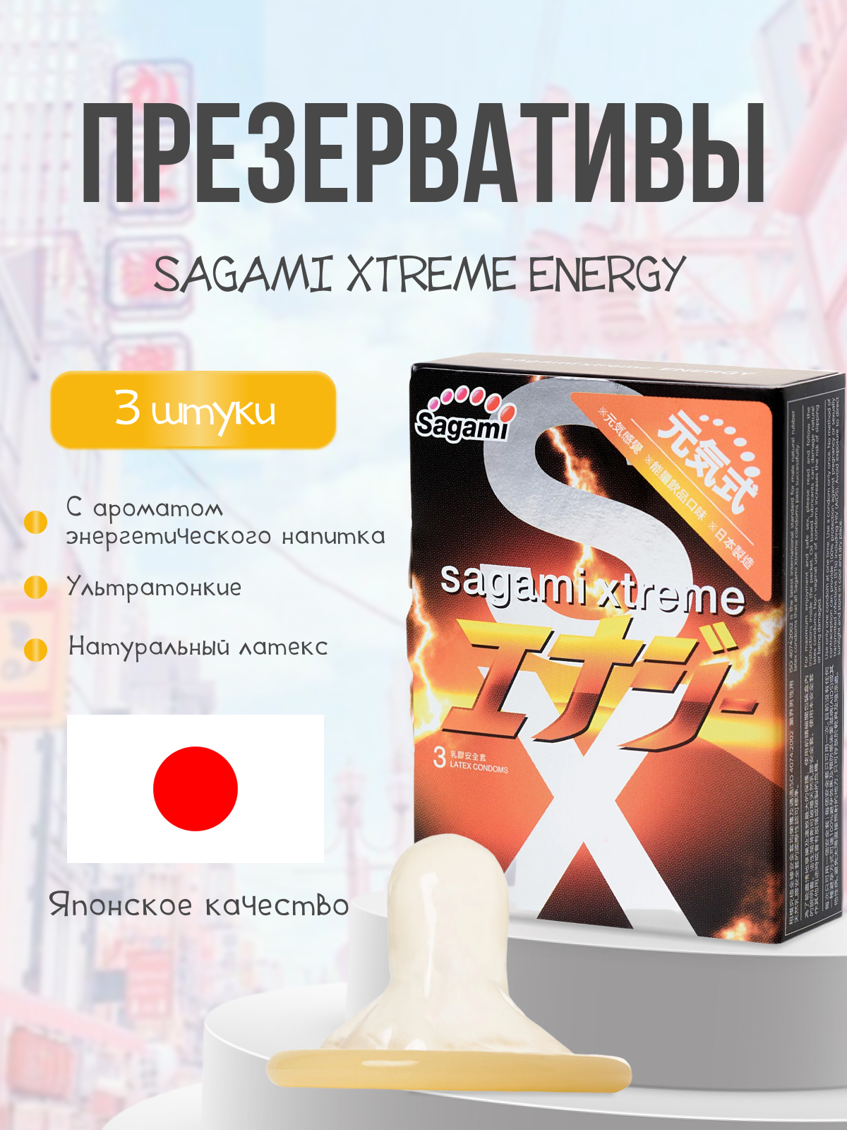 Презервативы ультратонкие Sagami Xtreme Energy со вкусом энергетика 3 шт - lovestoryshop.ru
