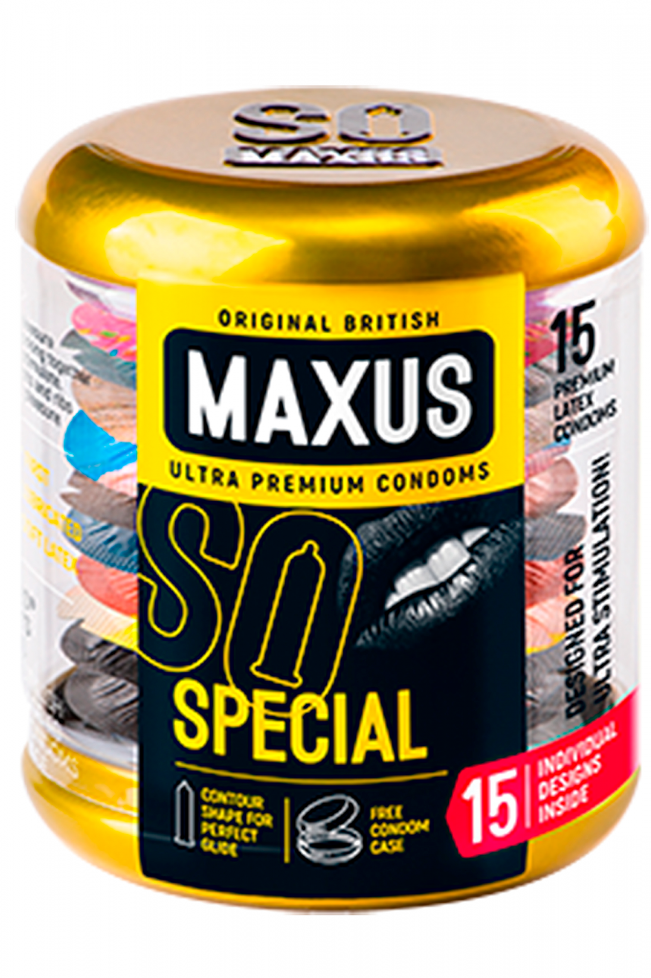 Это большая упаковка из 15 презервативов в ярких упаковках с рисунками, в комплекте добавлен круглый металлический кейс жёлтого цвета, который легко открывается и закрывается. Вместительность кейса — 3 презерватива. Удобная упаковка позволит носить изделия с собой, не деформируя содержимое, можно положить кейс в карман или сумку — и с презервативами всё будет в порядке.