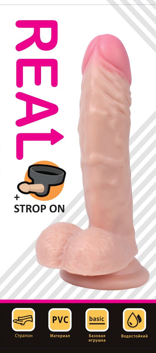 В этом небольшом наборе Real находятся трусики для страпона на ремешках и реалистичная насадка с присоской, которую также можно использовать отдельно в качестве фаллоимитатора. Основная часть игрушки выполнена из гибкого двухслойного ПВХ — с плотным стержнем и мягкой поверхностью, которую можно совмещать с лубрикантами на любой основе. Реалистичный дизайн фаллоимитатора обладает выраженной головкой, легким рельефом и мошонкой для дополнительной стимуляции.