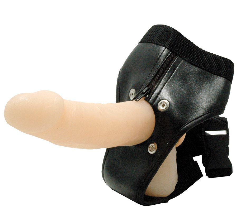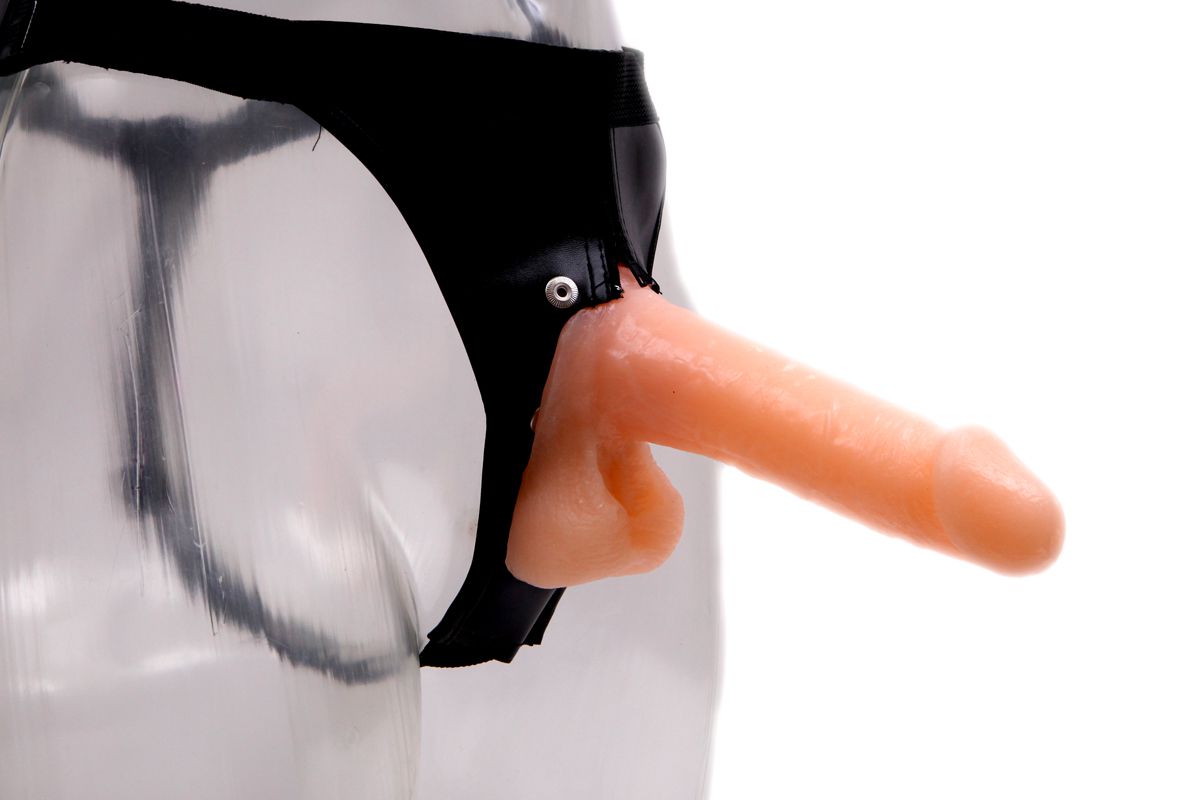 Эти трусики из кожзаменителя плотно обтянут ваши бёдра благодаря регулируемым ремешкам. В ту же секунду вы превратитесь из сексуальной партнерши в…партнёра, ведь внизу вас будет украшать большой напряженный фаллос с гладеньким тельцем и большой головкой.