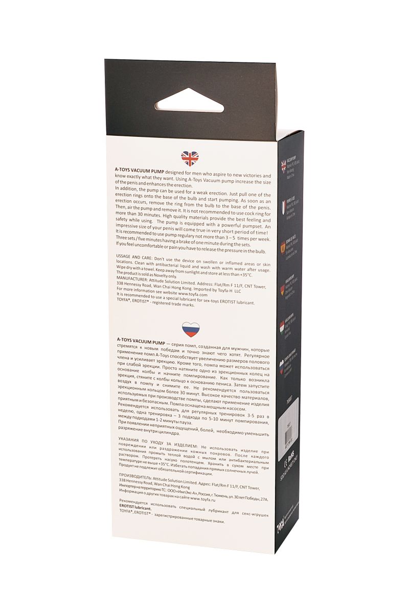 A-Toys Vacuum pump — серия помп, созданная для мужчин, которые стремятся к новым победам и точно знают чего хотят. Регулярное применение помп A-Toys способствует увеличению размеров полового члена и усиливает эрекцию. Высокое качество материалов, используемых при производстве помпы, сделают применение изделия приятным и безопасным. Помпа оснащена мощным насосом, а также механизмом вибрации, которое крепится к помпе с помощью эластичного материала с кармашком для виброяичка и управляется выносным пультом.