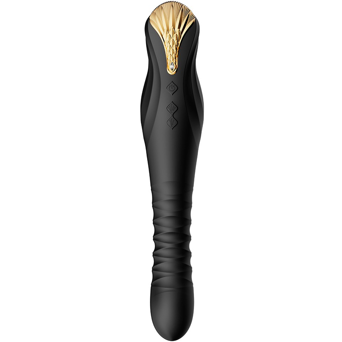 Дизайн вибратора Zalo King был вдохновлён золотой маской древнеегипетских правителей, верхнюю часть которой украшают стилизованные изображения орла и кобры, переплетённых в форме лотоса. Два независимых друг от друга мотора отвечают за глубокие ритмичные толчки со скоростью до 40 движений в минуту, имитирующие настоящие фрикции (8 режимов), и вибрацию - 4 паттерна, от самых нежных до мощных.