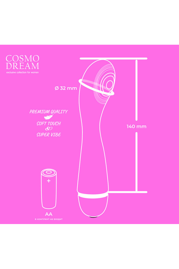 Вибратор работает от одной батарейки типа АА, которая не входит в комплект. Рабочая длина - 14 см, максимальный диаметр - 3.2 см. -
