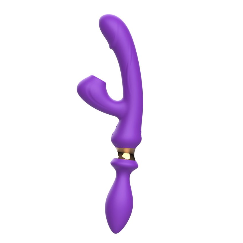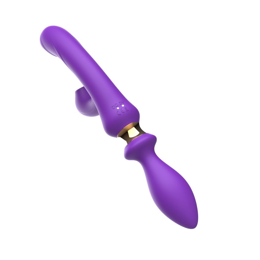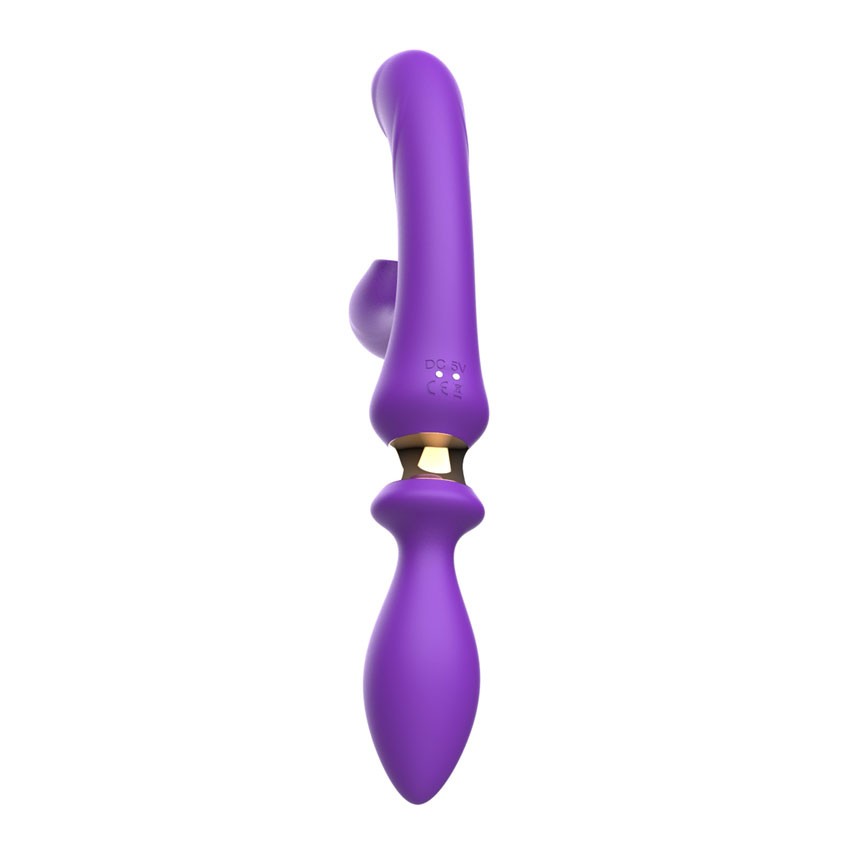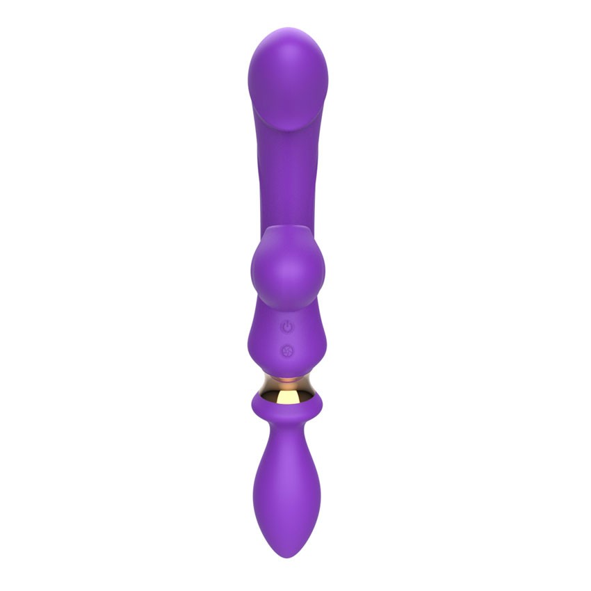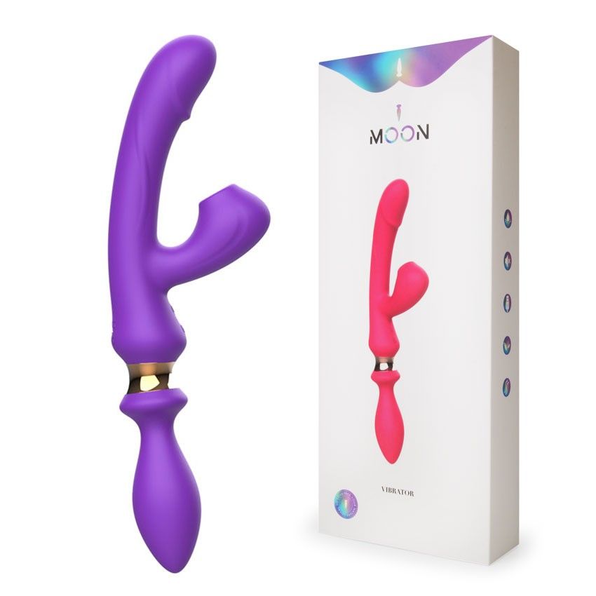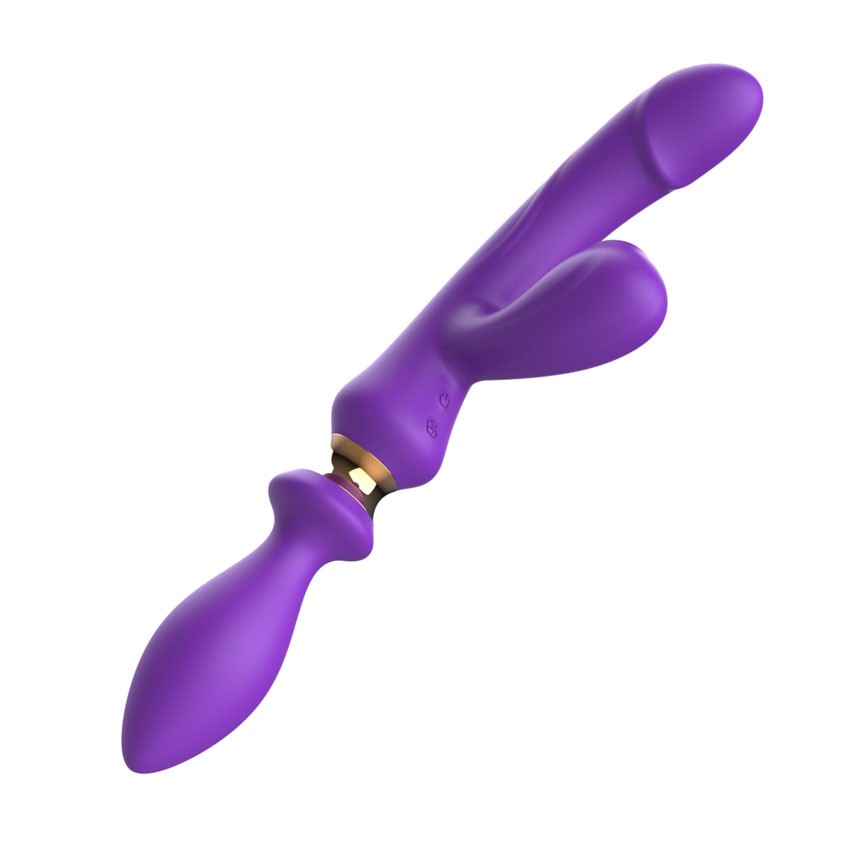 Фиолетовый двусторонний вибромассажёр с клиторальным отростком - 30 см. - lovestoryshop.ru