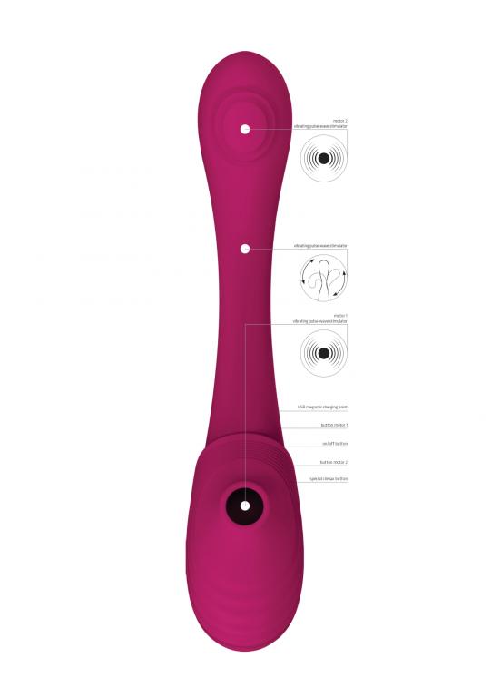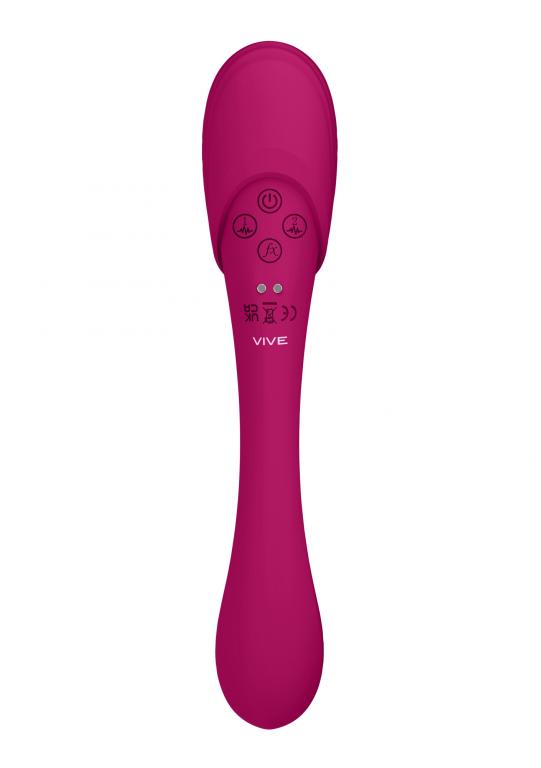 Благодаря своей форме позволяет осуществлять как внутреннюю, так и внешнюю стимуляцию. Изготовлено изделие из шелковистого медицинского (гипоаллергенного) силикона и как большинство моделей линейки VIVE имеет кнопку мгновенного оргазма, запуская все моторы на максимум одним касанием. Такой вибратор можно брать с собой в ванную и душ. Рабочая длина - 14,8 см.
