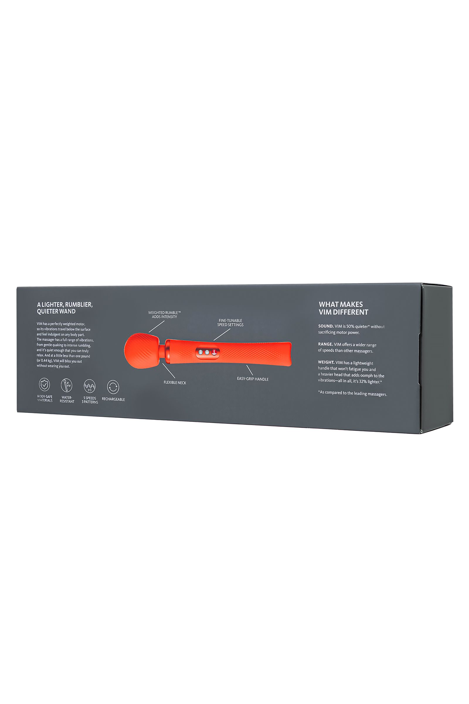 Внутри массажер Fun Factory приобрел абсолютно новый утяжеленный мотор, который предоставляет качественную, глубокую вибрацию на любом из режимов. Удобное управление позволяет контролировать уровень стимуляции, переключаясь между 3 ритмами и 5 вариантами скорости. Вибрация сосредоточена лишь в головке массажера, а общий вес Vim составляет 430 грамм, что на 32% меньше стандартных моделей — так вы точно не устанете держать игрушку в руках даже в течение длительного времени.