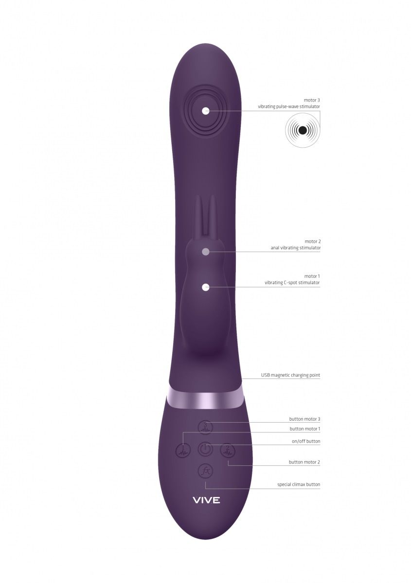 Изготовлено изделие из шелковистого медицинского гипоаллергенного силикона и как большинство моделей линейки VIVE имеет кнопку мгновенного оргазма, запуская все моторы на максимум одним касанием. Такой вибратор можно брать с собой в ванную и душ. Рабочая длина - 12,2 см.