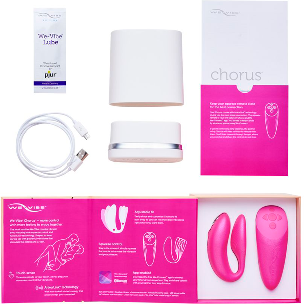 We-Vibe Chorus – высокотехнологичный сенсорный вибромассажер, оснащенный новым пультом управления «Squeeze Remote» с реагирующей технологией Touch-sense. Игрушка имеет возможность создания уникальных «плейлистов» вибрации и управления на любом расстоянии из любой точки мира. Вибромассажер выполнен из высококачественного необычного безопасного силикона, не содержащего фталатов, бисфенола А и латекса.