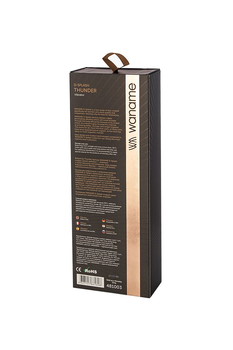 Вибратор Thunder бренда WANAME D-Splash создан самой любовью — любовью к качественному наслаждению, ведь каждая игрушка этого бренда — идеальный баланс технологичности и изысканности. WANAME D-Splash работает на низкочастотной вибрации - 6 режимов вибрации. Эта вибрация настолько мощно, настолько глубоко распространяются по всему телу, что длительные оргазмы невероятной силы становятся постоянной составляющей. Рабочая длина - 13,5 см.