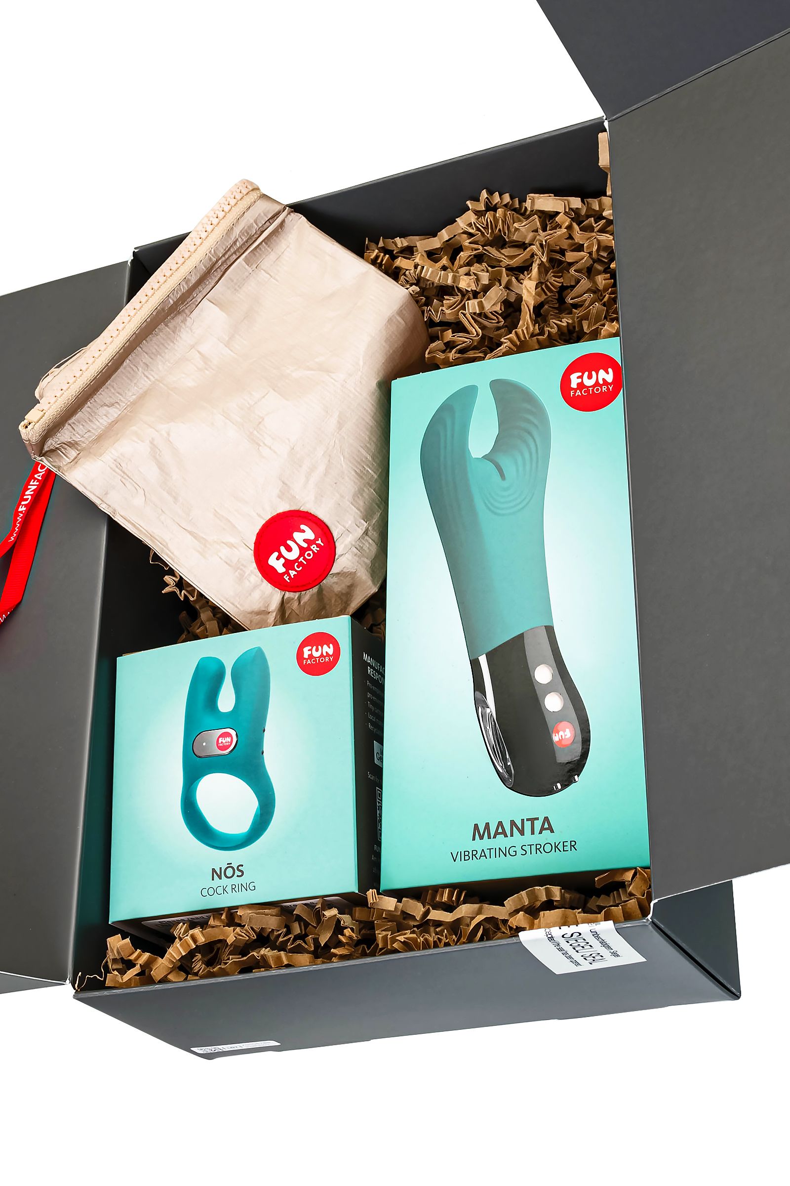 Набор Fun Factory «Next level orgasm» включает в себя две игрушки для мужского удовольствия: необычный вибратор Manta и эрекционное виброкольцо Nos.