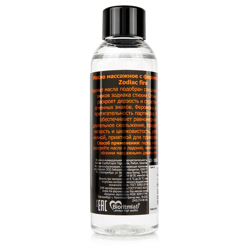 Аромат масла подобран специально для знаков зодиака стихии Огня. Он раскроет дерзость и страстность огненных знаков. Феромоны усилят притягательность партнёров. Масло обеспечивает равномерное и длительное скольжение, придаёт коже мягкость и шелковистость, делает её нежной, приятной для прикосновений.