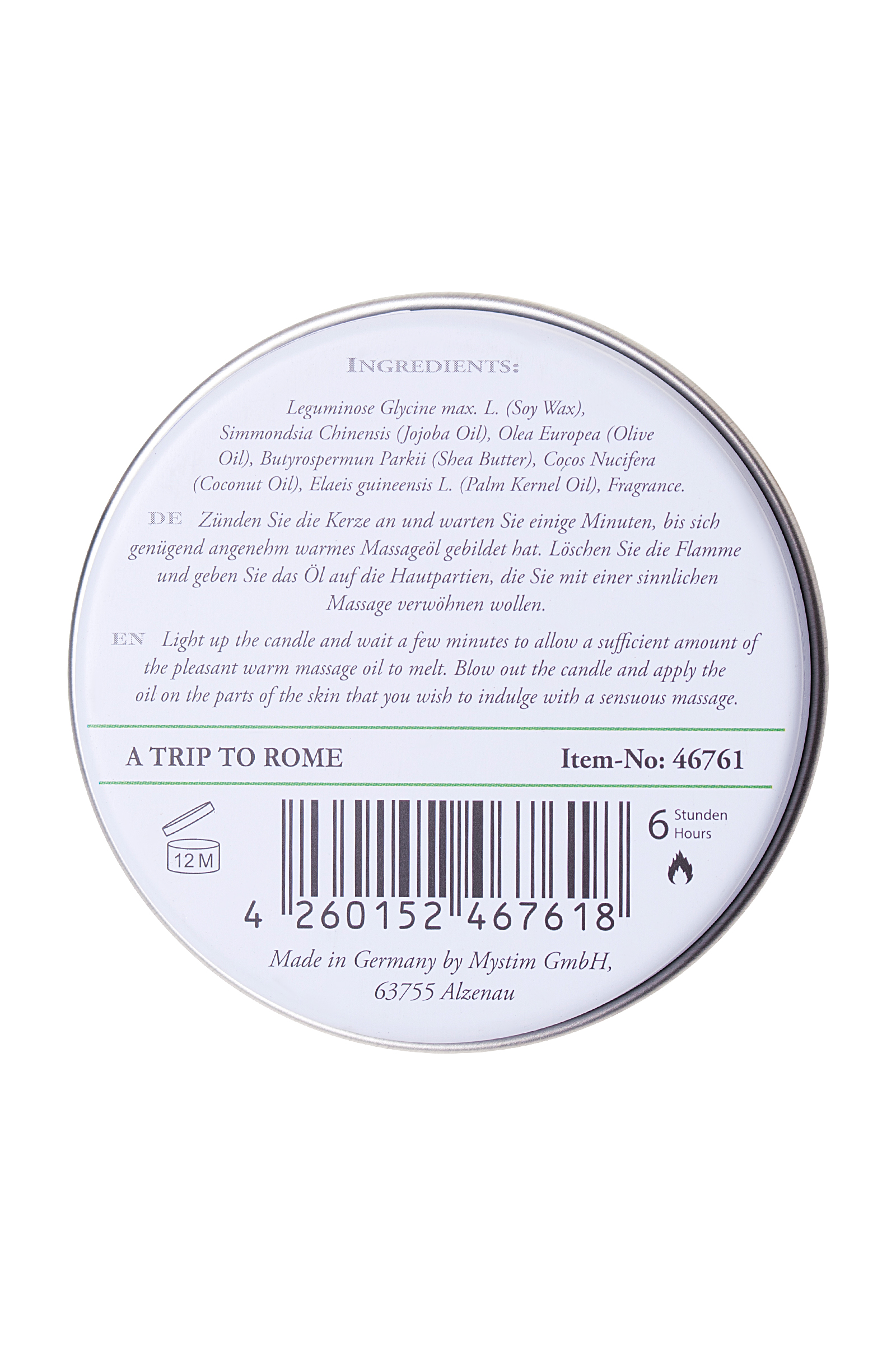 Время горения до 6 часов. Свеча Mystim упакована в металлическую баночку.