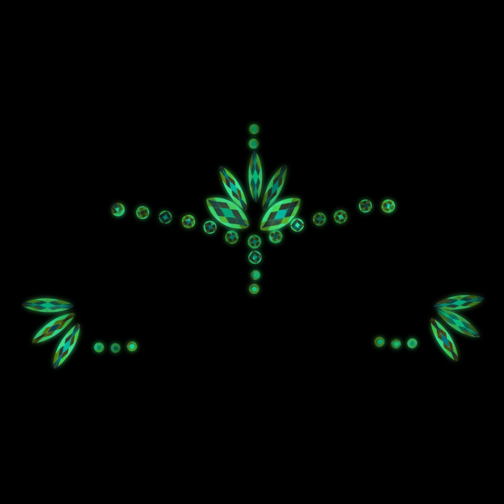 Великолепное украшение, которое станет отличным дополнением к любому наряду, даже к наряду матери природы. Красивые камни выполнены под опал и крепятся на кожу на клейкой основе. Люминесцентный порошок накапливает заряд яркого света и потом светится в темноте.